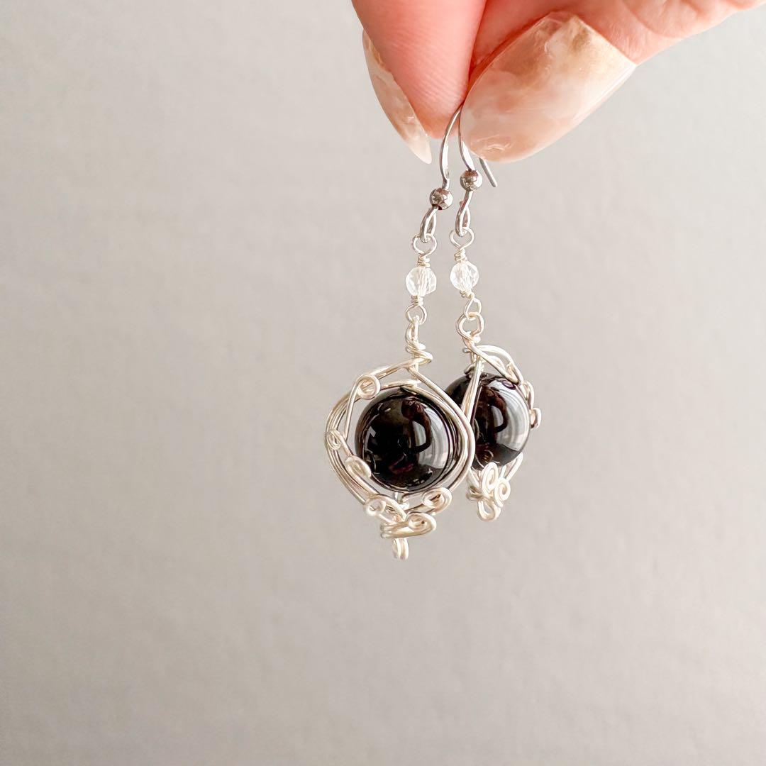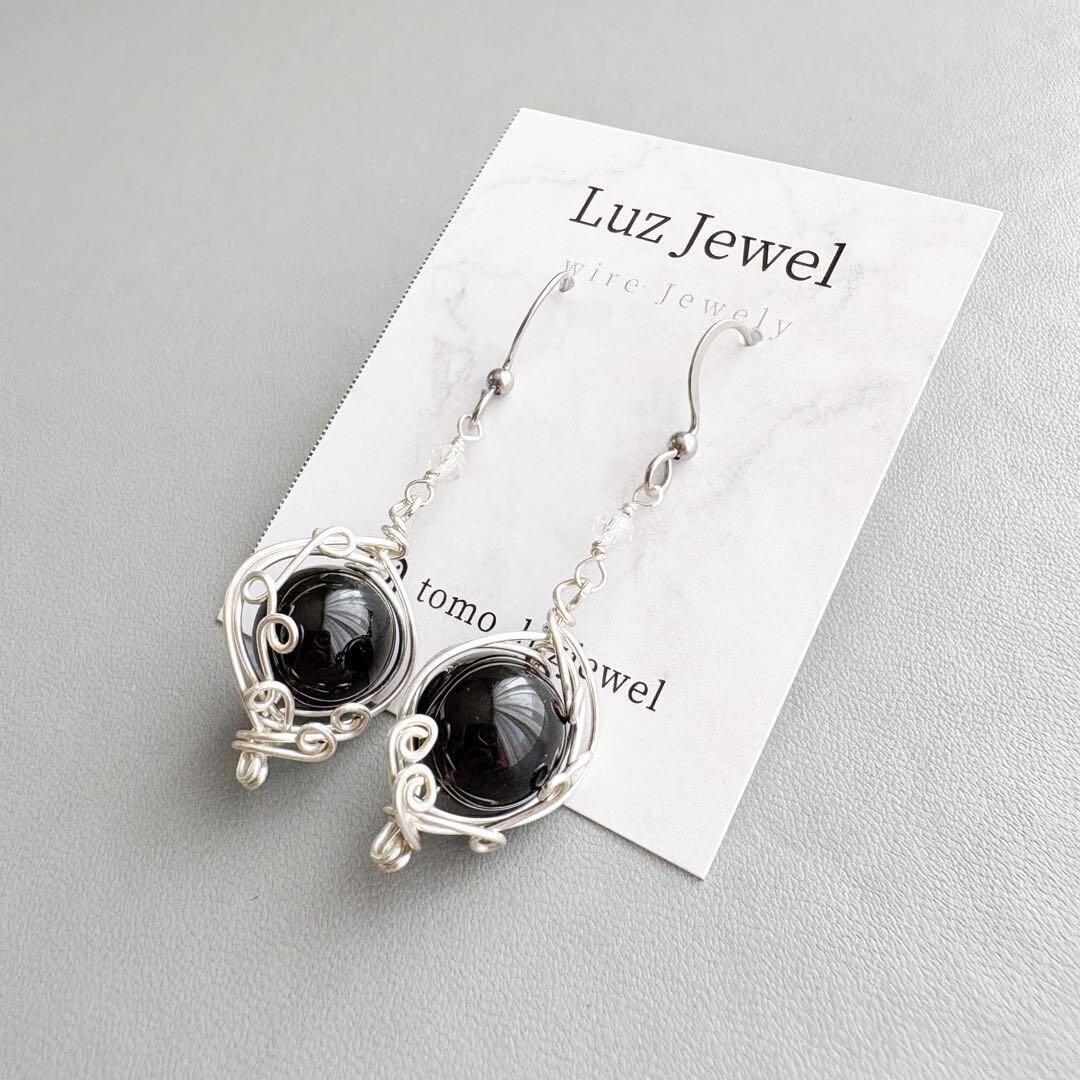 神秘的な黒の輝きを放つモリオンを、繊細なシルバーワイヤーで包み込んだピアス。