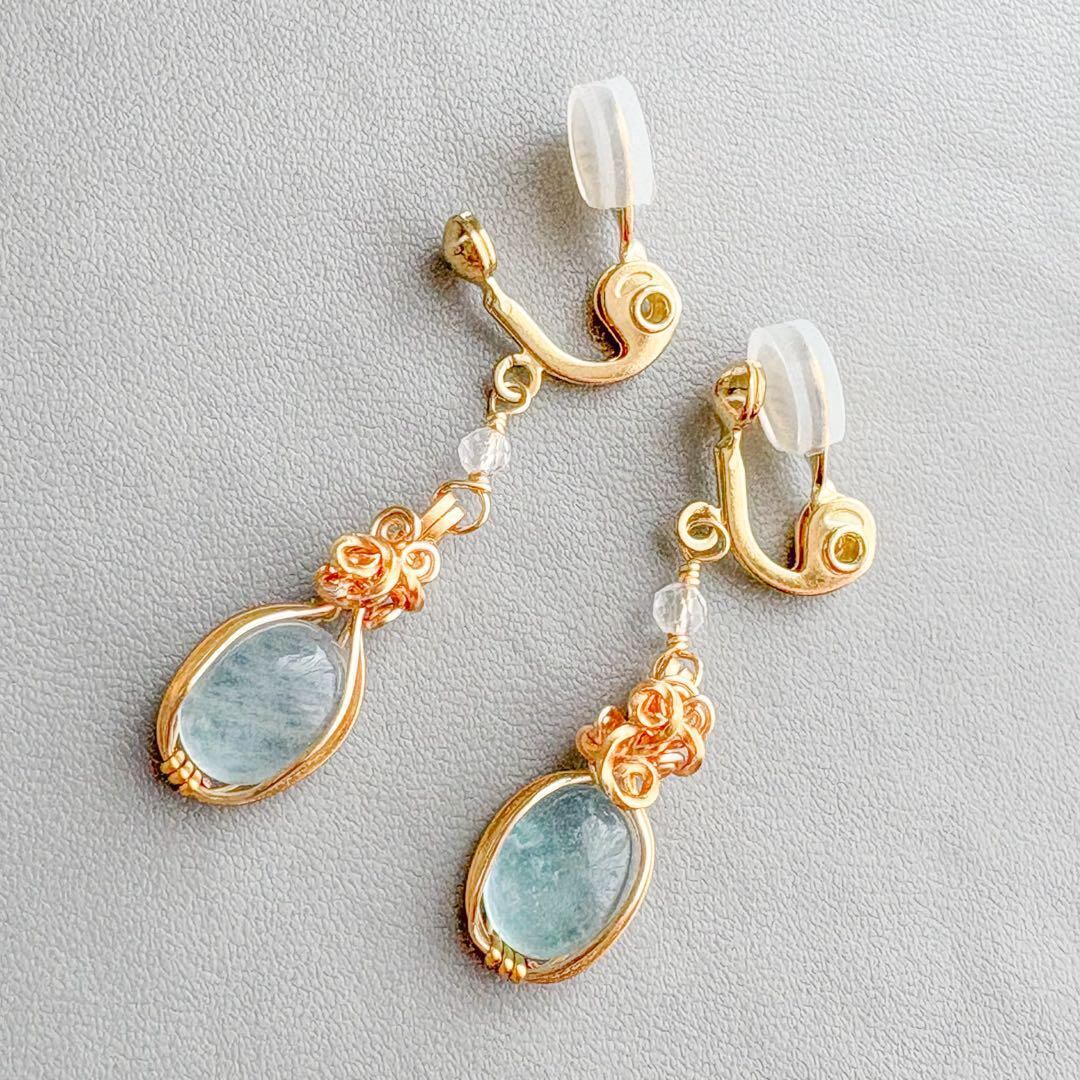 痛くないイヤリング つやぷるアクアマリン ワイヤーラッピング 涼し気ブルー