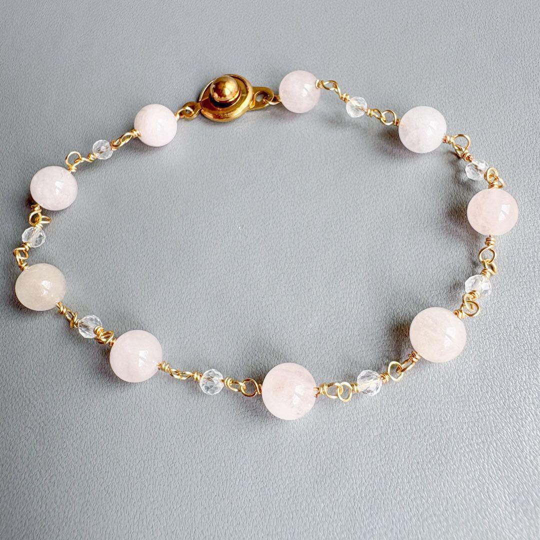 淡いピンク系カラーの石モルガナイトとクリスタルのブレスレット。