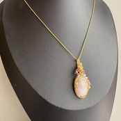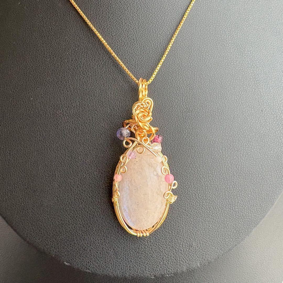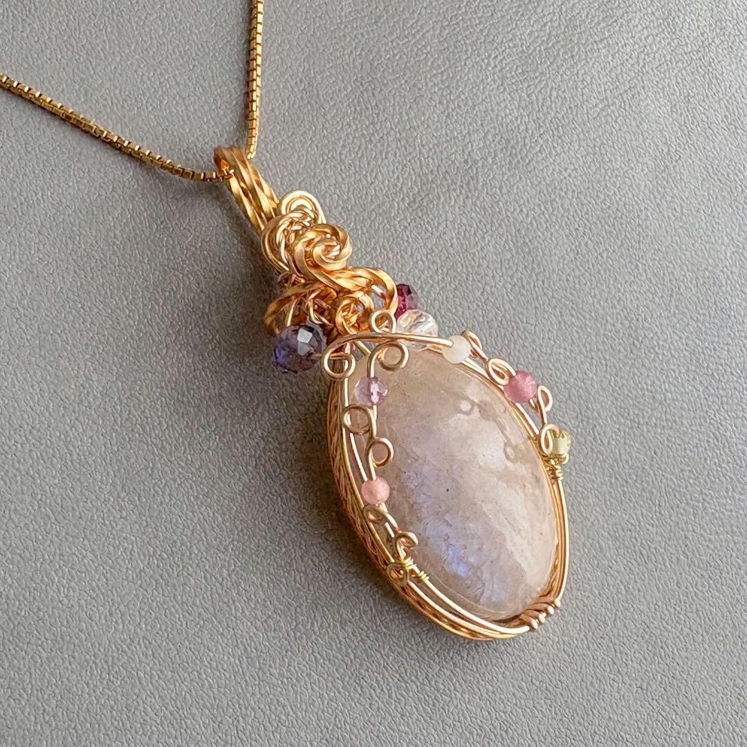 ゴールドワイヤーで丁寧にラッピングし、ローズピンクやパープルの小さな天然石をあしらいました。